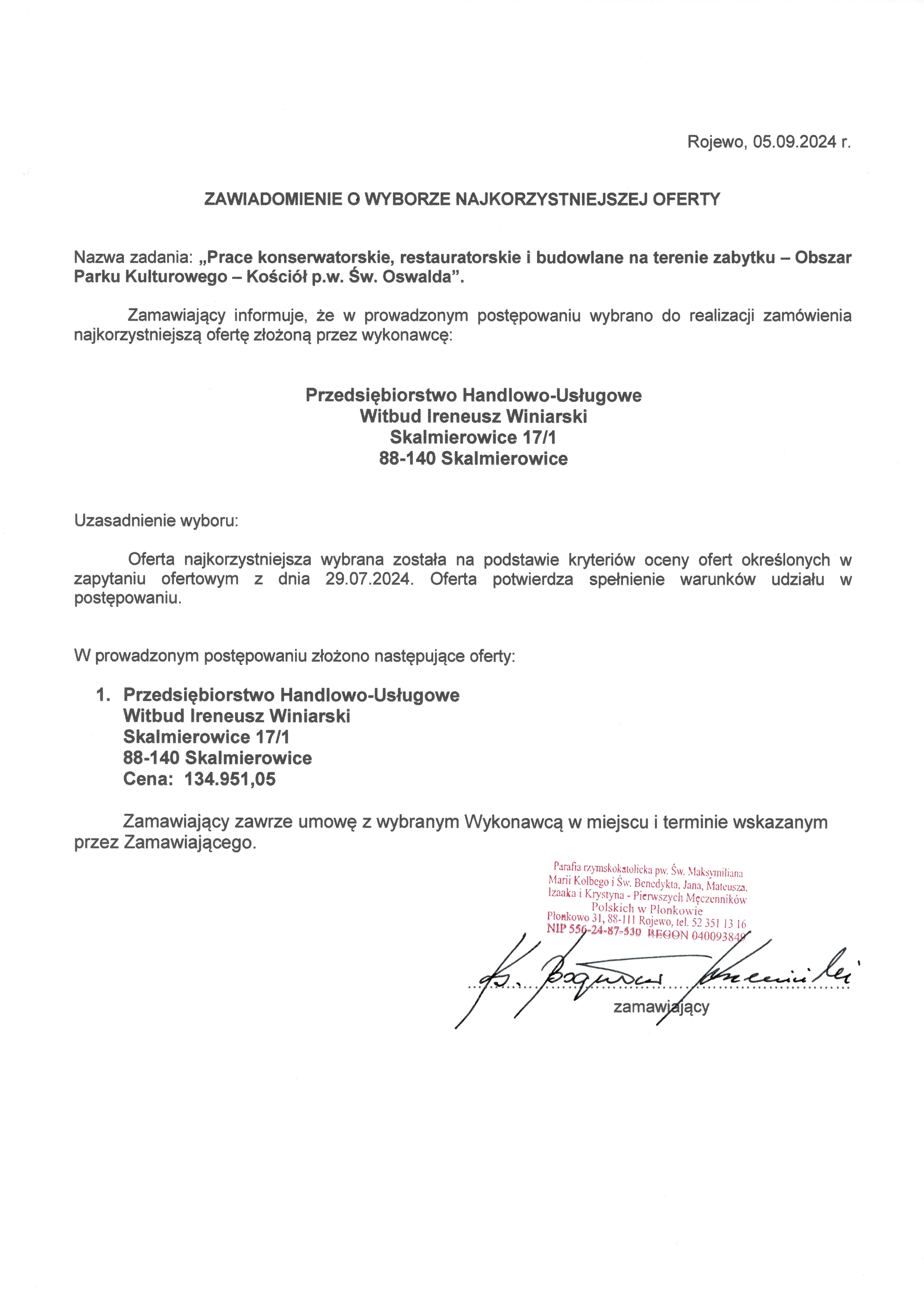dotyczy zadania pn. „Prace konserwatorskie, restauratorskie i budowlane na terenie zabytku – Obszar Parku Kulturowego - Kościół p.w. Św. Oswalda”.